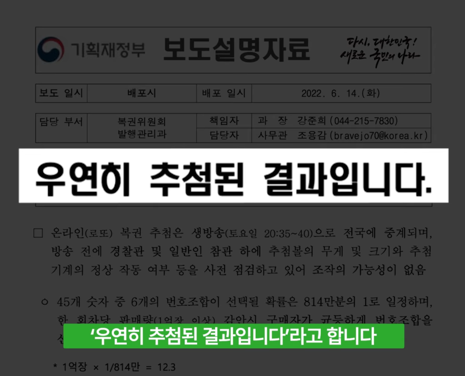 1019회차 1등이 50명이나 나온 것에 대해 복권위원회에서 자체적으로 해명을 한 건데요. 2022년 6월 14일에 배포한 자료로, 일단 제목부터 크게 ‘우연히 추첨된 결과입니다’라고 합니다.