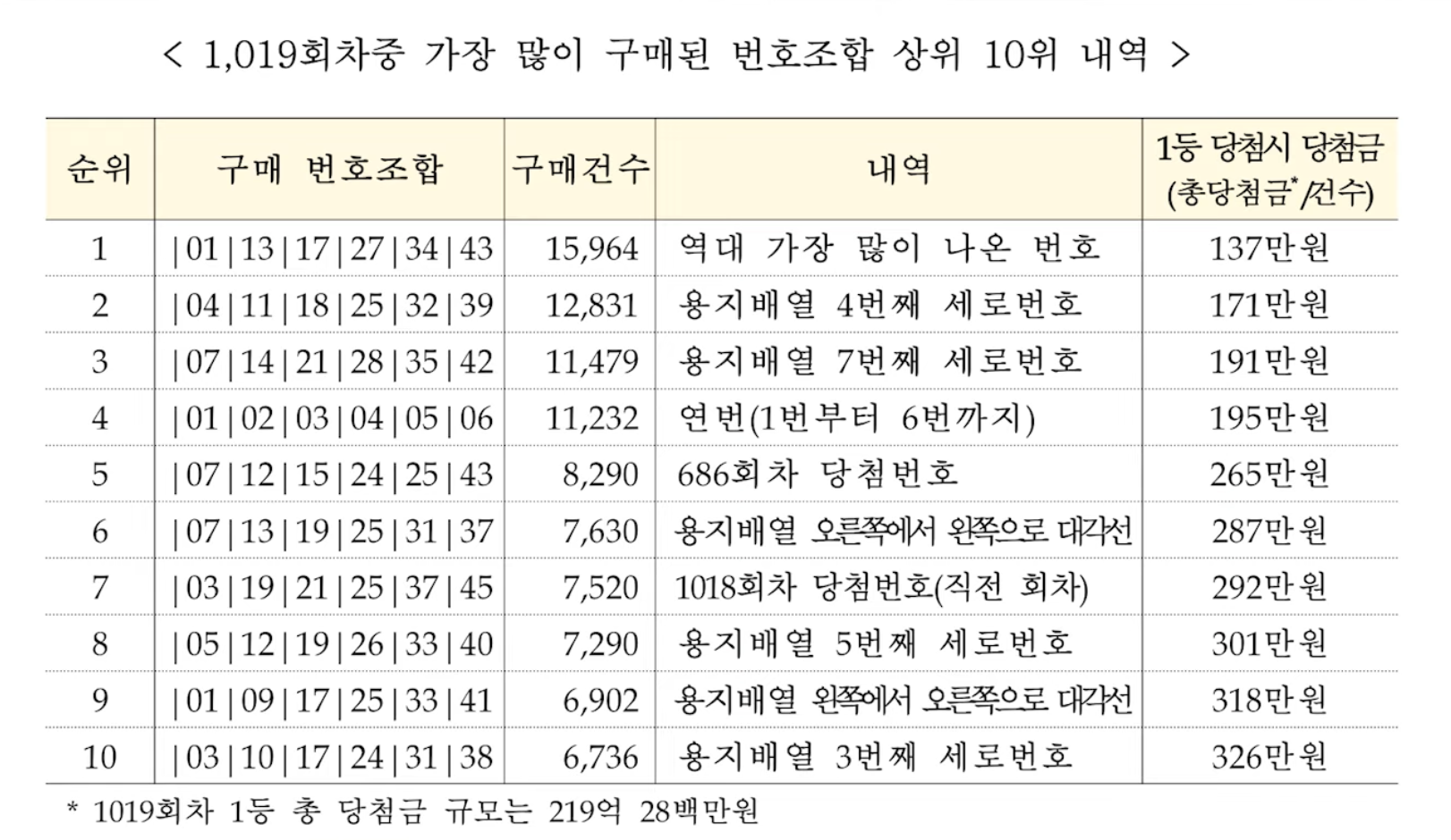 이런 식으로 인기가 유독 많은 번호 조합도 이 당시 보도자료에 함께 첨부가 되어 있는데요. 로또 구매하실 분들 참고하시라고 첨부해드릴 테니 이 번호는 피하시는 걸 추천 드립니다. |