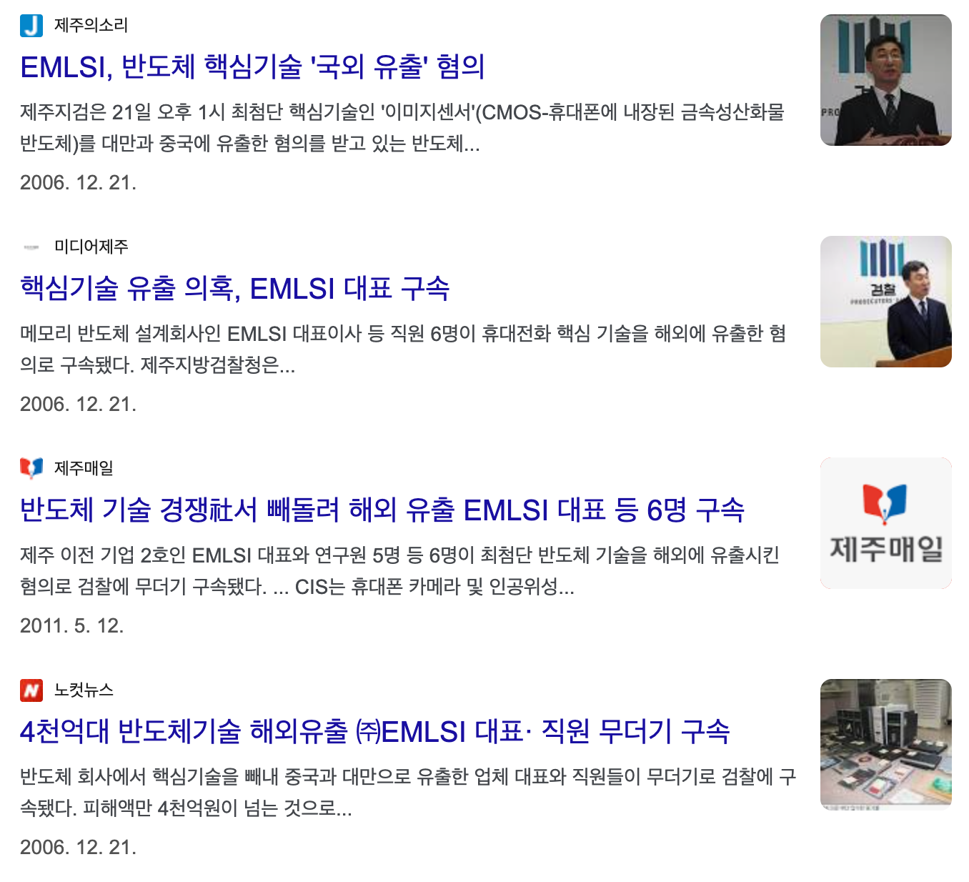 EMLSI. 꽤 유명한 사건이 있었죠. 여기 기사를 보시면요. 반도체회사에서 핵심기술을 빼내 중국과 대만으로 유출한 업체의 대표와 직원들이 검찰에 구속됐다고 합니다. 피해액은 4천억 가량이고요.